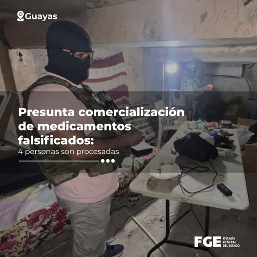 La Fiscalía General del Estado procesa a cuatro personas por su presunta participación en el delito de producción, fabricación, comercialización y distribución de medicamentos e insumos médicos falsificados o adulterados. El operativo se ejecutó el viernes 10 de abril en los sectores de Mapasingue y Bastión Popular, en el noreste de Guayaquil.