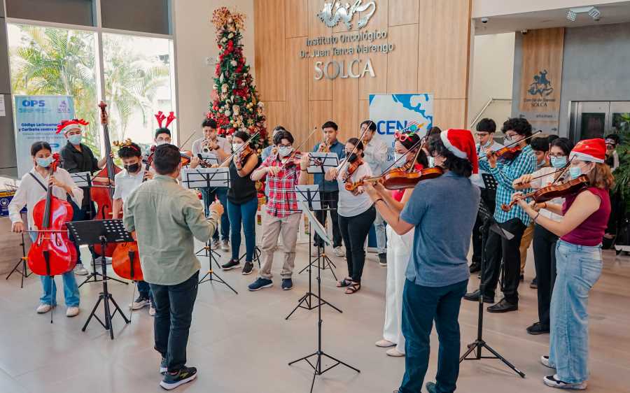 • La Orquesta Sinfónica Juvenil José Joaquín de Olmedo presentó un repertorio de canciones clásicas navideñas. Los pacientes de SOLCA y sus familiares disfrutaron de un momento alegre y se contagiaron del espíritu navideño.