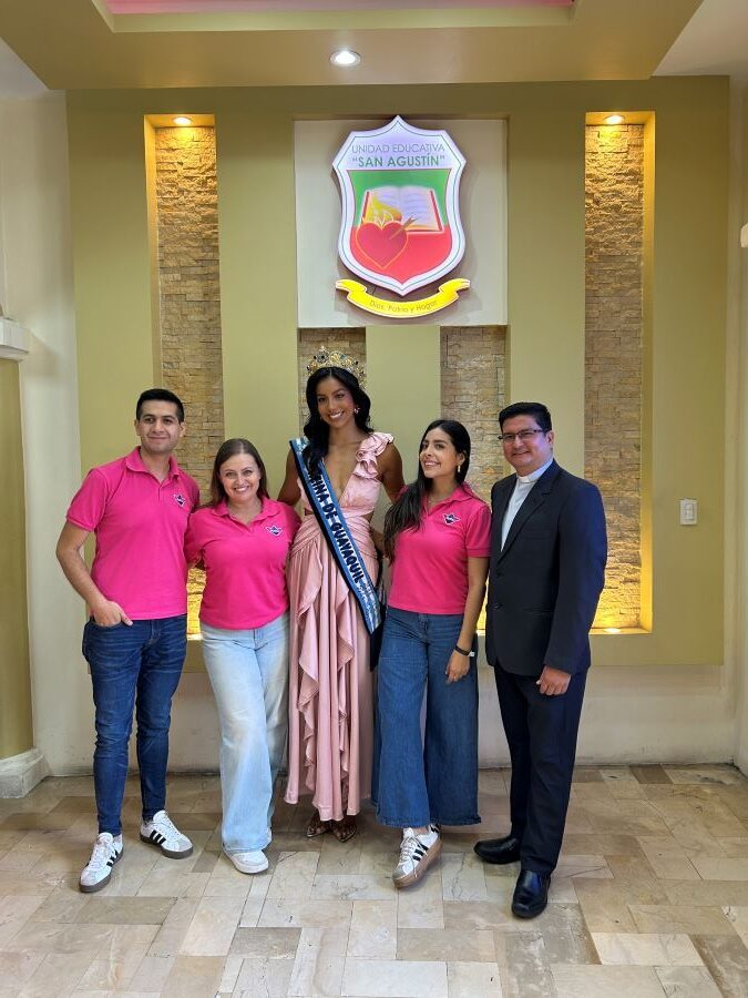 Guido Reveló, Coordinador de Categoría Nosotras; Paola Mena, Gerente marca Nosotras; Jenniffer Tutivén, Reina de Guayaquil; Soledad Vela, Coordinadora de marca; Padre Fray Wilson José Posligua, Rector de la Unidad Educativa San Agustín.