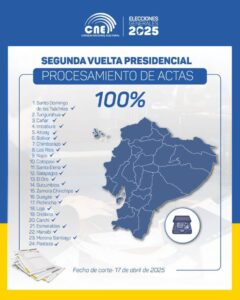 El Consejo Nacional Electoral (CNE), a través de sus redes sociales da a conocer que: “las actas de las 24 provincias del Ecuador han sido procesadas al 100 por ciento.