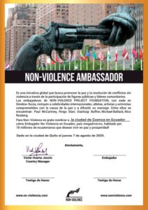 El anuncio fue realizado por Víctor Huerta Jouvin, director de la Fundación Non-Violence en Ecuador, con sede en la capital ecuatoriana, Quito. “Este reconocimiento es un motivo de orgullo para la ciudad y un estímulo para seguir trabajando en la promoción de la no violencia y la solidaridad comunitaria”.