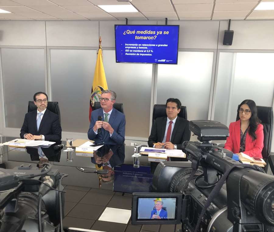 Precisó que ya se tomaron medidas para que los que más tienen contribuyan para enfrentar la crisis. Es así que las 510 empresas más grandes del país, incluidos los bancos, harán una autorretención mensual para obtener una recaudación de USD 1.300 millones. Además, el gobierno decidió no reducir el ISD y mantenerlo en 3.5 %, y eliminó la exención del ISD a la banca privada por los pagos de préstamos al exterior.