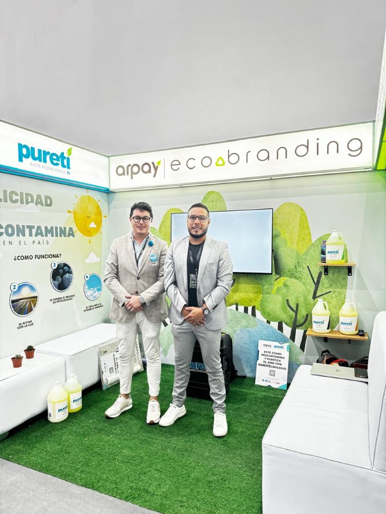 Otra de las iniciativas que maneja la marca es un producto llamado Pureti, que es un recubrimiento fotocatalítico que limpia el aire gracias a sus nanopartículas de dióxido de titanio. En palabras más sencillas, se trata de un líquido transparente con el que se pulveriza un stand, una lona, un roll up, un backing, o cualquier tipo de superficie y permite purificar el aire alrededor; funciona o reacciona con la luz solar. El mayor impacto de esta innovación podría ser, por ejemplo, colocarla en varios puntos a lo largo de una ciudad: vallas, paradas de buses, transporte público y otras superficies ubicadas en vías públicas, con el fin de generar una gran red de descontaminación.