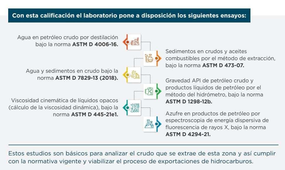 Con esta calificación el laboratorio pone a disposición los siguientes ensayos: Agua en petróleo crudo por destilación bajo la norma ASTM D 4006-16. Agua y sedimentos en crudo bajo la norma ASTM D 7829-13 (2018). Viscosidad cinemática de líquidos opacos (cálculo de la viscosidad dinámica), bajo la norma ASTM D 445-21e1.