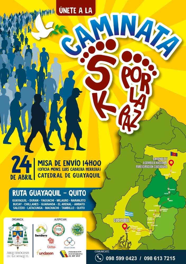 La Arquidiócesis de Guayaquil, su filial Fundación Nueva Vida y la Pastoral Social Cáritas invitan a la ciudadanía a participar de la “Caminata 5K por la paz del Ecuador”, esta iniciativa nace de los voluntarios y beneficiarios de la fundación que actúa en el sector de Las Malvinas en el sur de Guayaquil.
