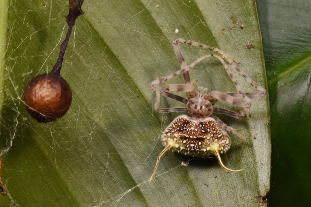 Es así que, en el campo, los investigadores inicialmente confundieron al ejemplar con una araña infectada por un hongo. La araña permanecía inmóvil, colgando boca abajo bajo una hoja, con protuberancias en el abdomen que simulan las estructuras reproductivas del hongo. Solo al tocarla se dieron cuenta de que se trataba de un animal vivo.